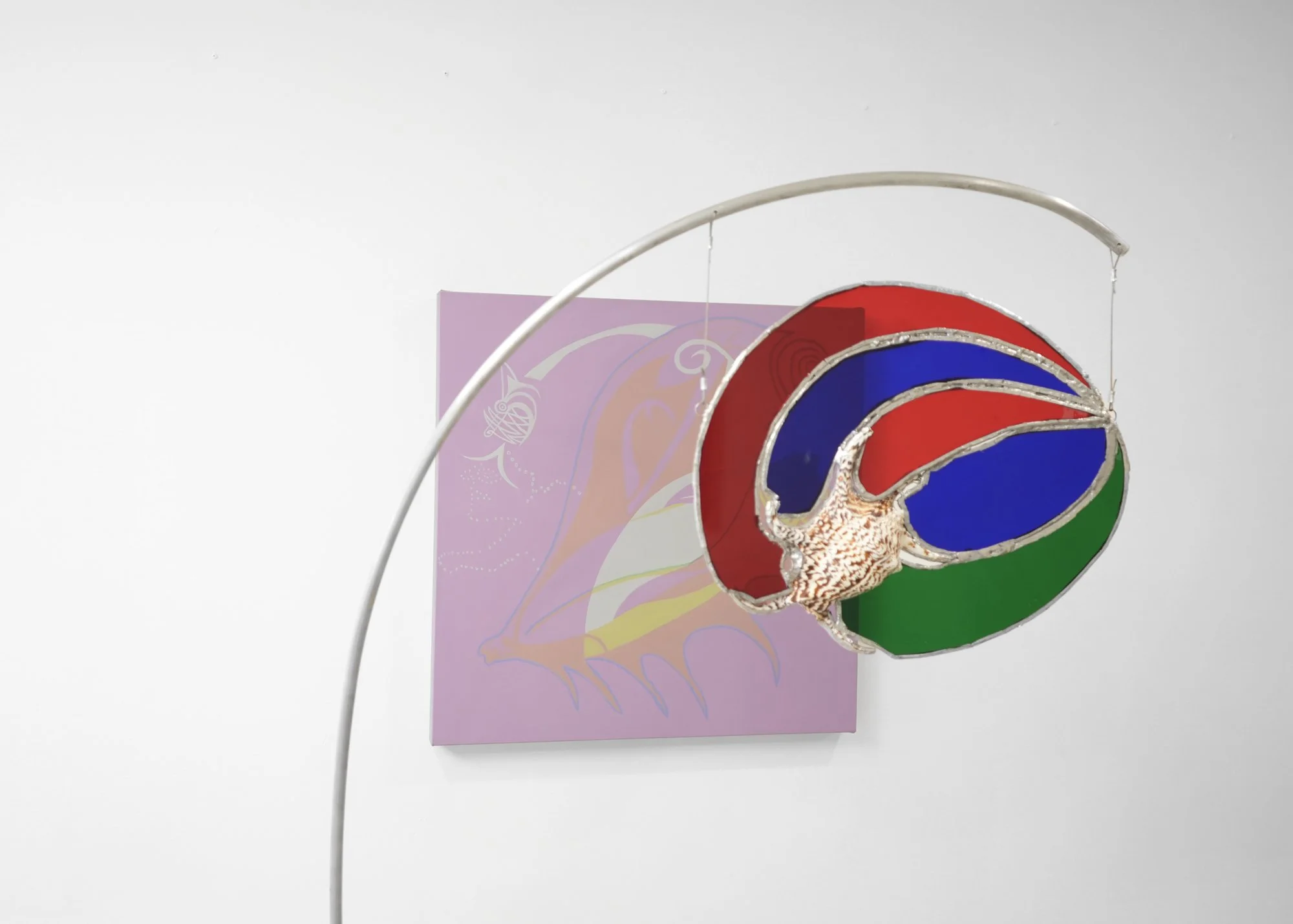 Tuned by spectrometer, desaturated hues of red, yellow, green, cyan, blue, and magenta form graphic compositions. Each is bounded by lines bent into obtuse curves and sharp angular cuts. There is an intentional obscurity to each image—figures, shells, and forms overlap and fragment. Only when viewed through stained glass objects, which serve as prismatic lenses of interpretation, do distinct images emerge. Each lens reveals a different composition, suggesting three simultaneous yet divergent narratives.